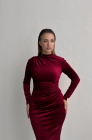 Облегающее бархатное платье-футляр элегантной длины миди насыщенного винного цвета - идеальный выбор для любого торжества. Изящное платье удачно подчёркивает женственные изгибы и скрывает нюансы фигуры за счёт лёгкой драпировки.